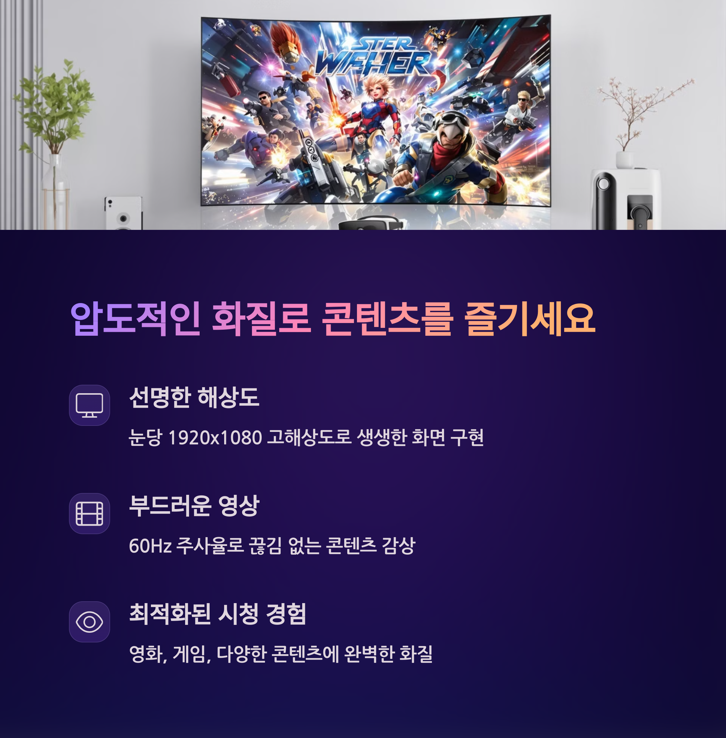 | 넷플릭스 및 기타 앱 시청에 최적화 | 영화관 수준의 시청 경험 제공 | 간단한 연결로 다양한 기기에서 사용 가능 |