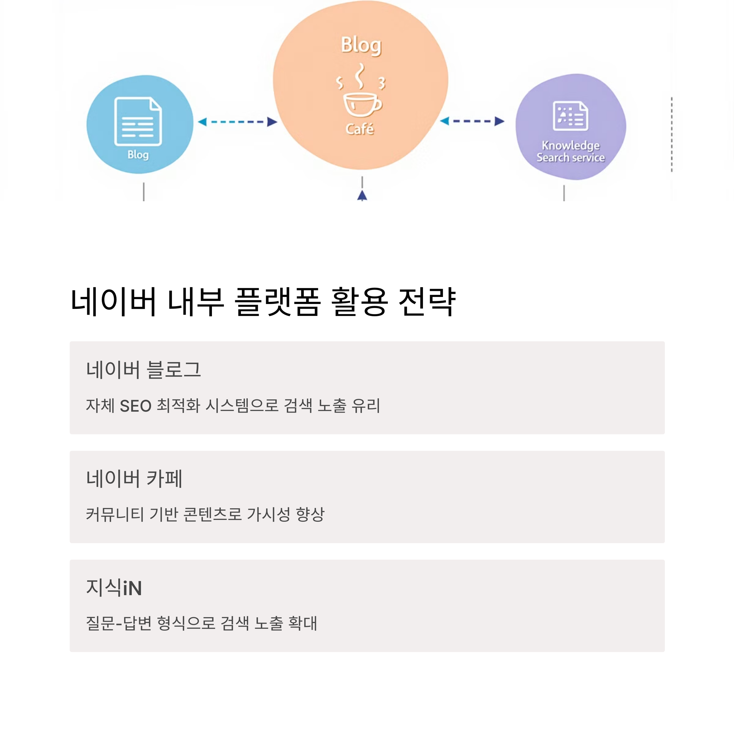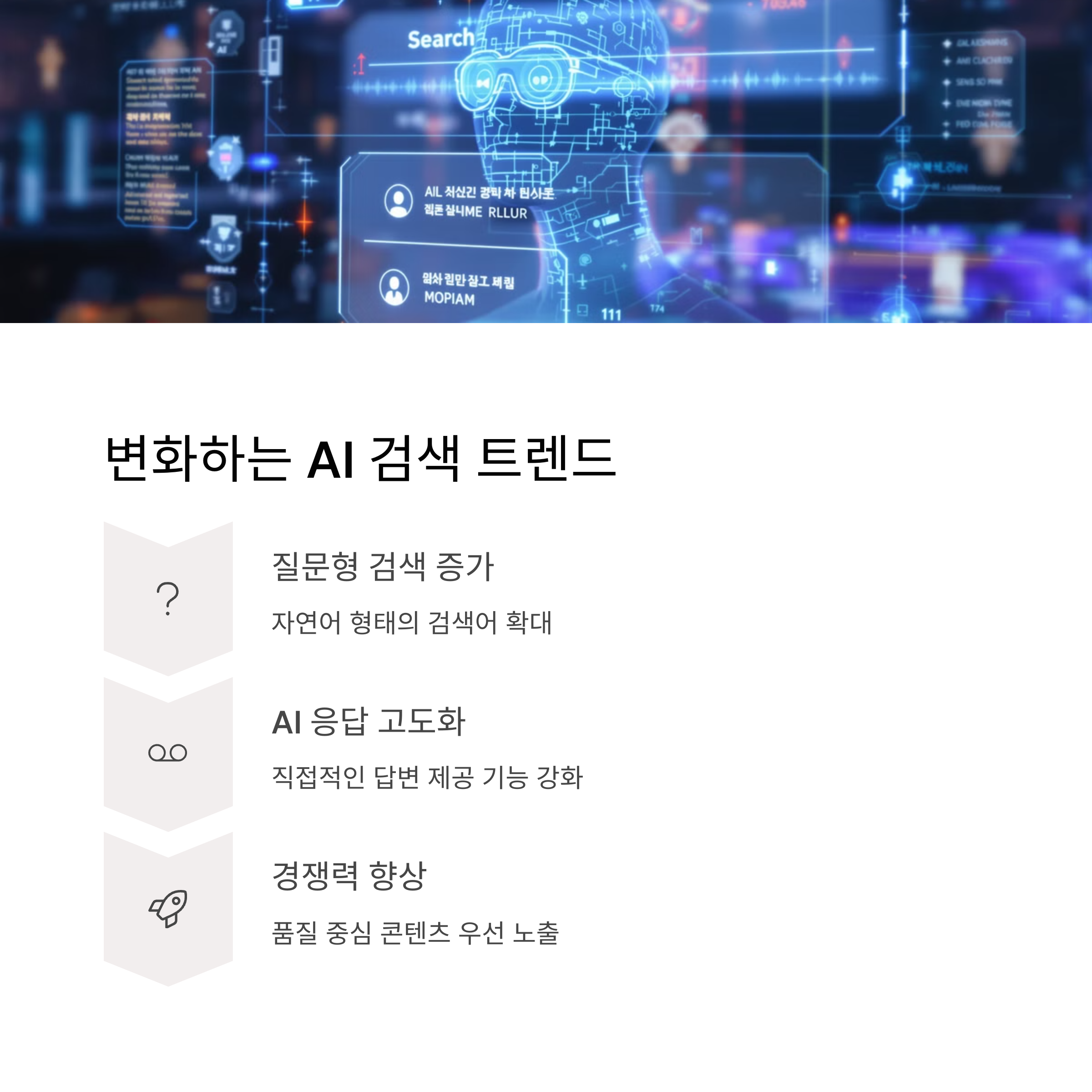 | 사용자 의도와 일치하면 AI 콘텐츠도 노출 | 블로그, 카페, 사용자 참여도 중요 요소 | 질문형 검색어에 요약 콘텐츠 제공 |