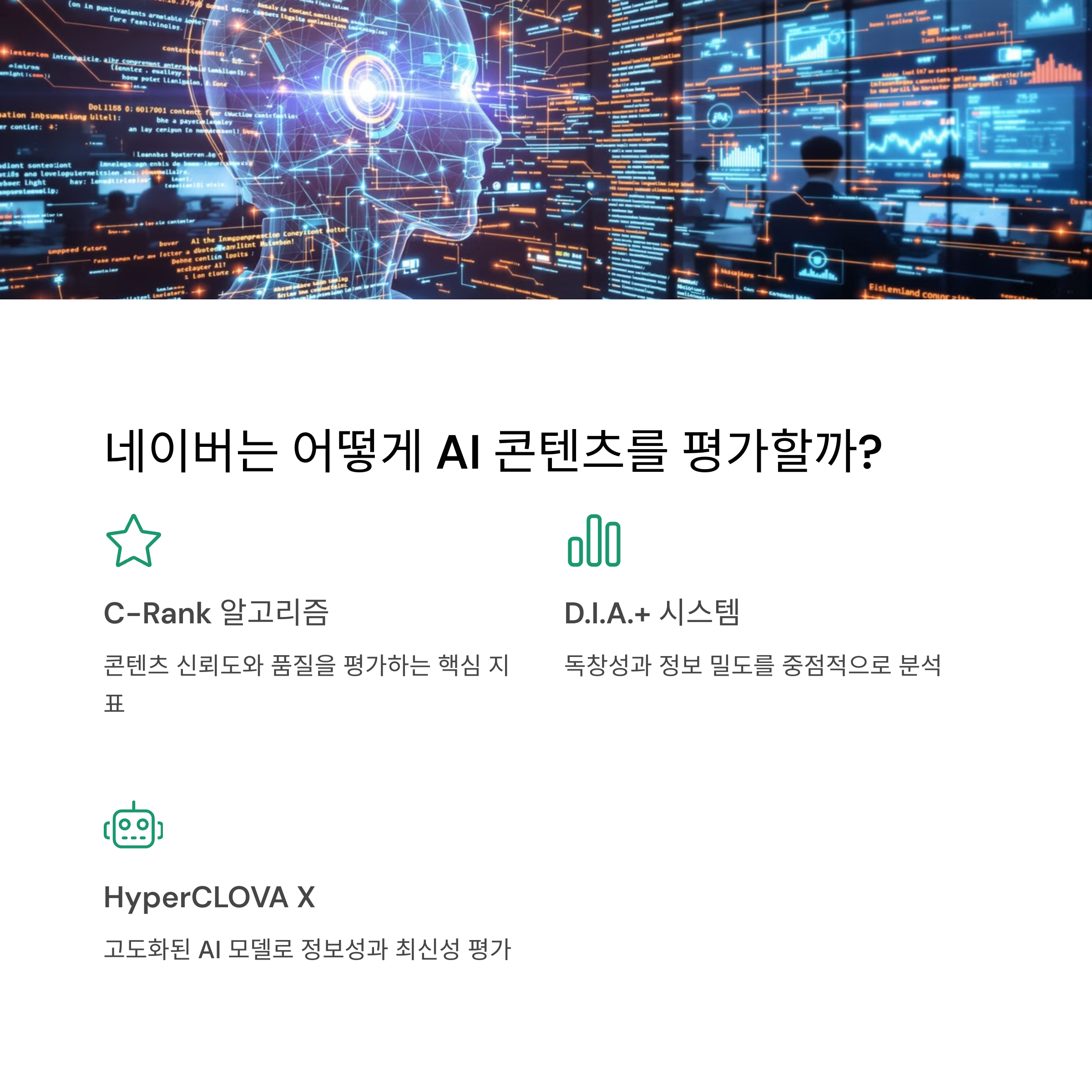 | C-Rank, D.I.A.+가 신뢰성 및 정보성 평가 | 키워드, 메타 태그, 시각 자료 활용 중요 | AI가 작성한 콘텐츠도 분석·요약·노출 가능 |
